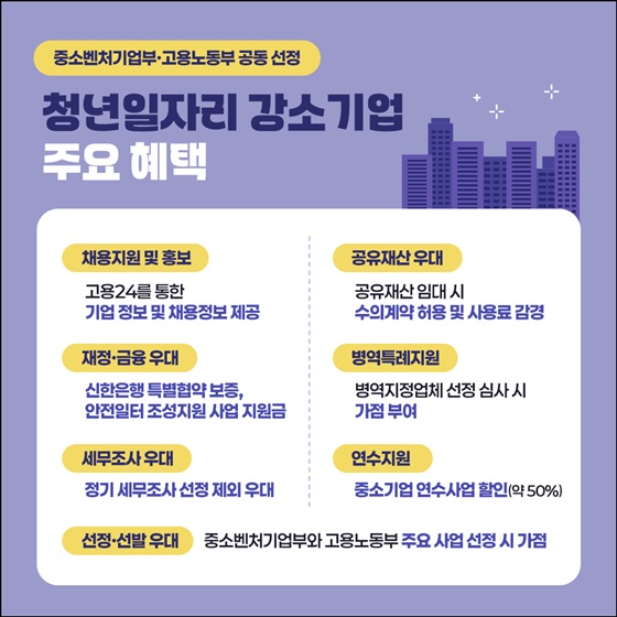 청년일자리 강소기업은 중소벤처기업부 및 고용노동부 주요 사업 선정 시 가점을 받을 수 있습니다.