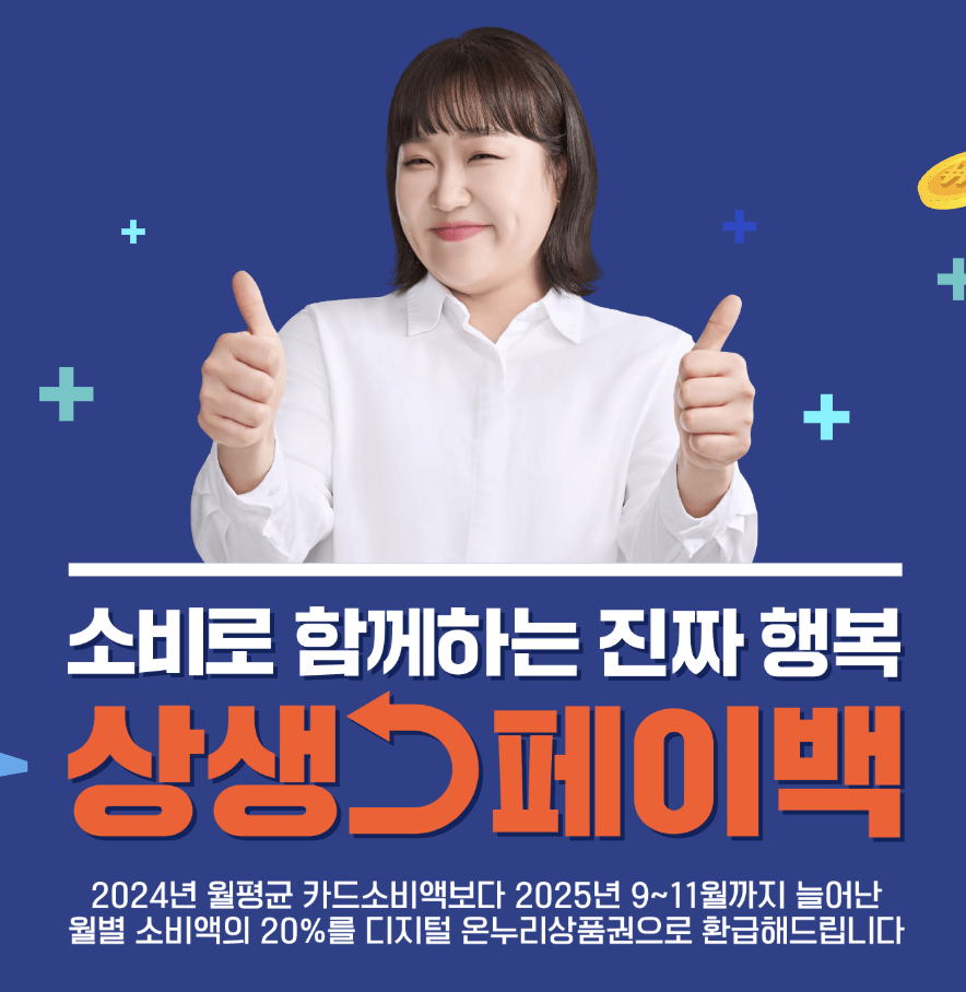 2024년 월평균 카드 소비액보다 2025년 9~11월 소비가 늘어난 금액의 20%를 👉 디지털 온누리상품권으로 환급해주는 제도입니다.