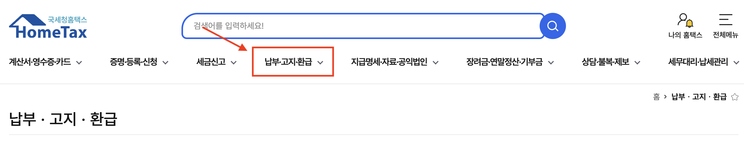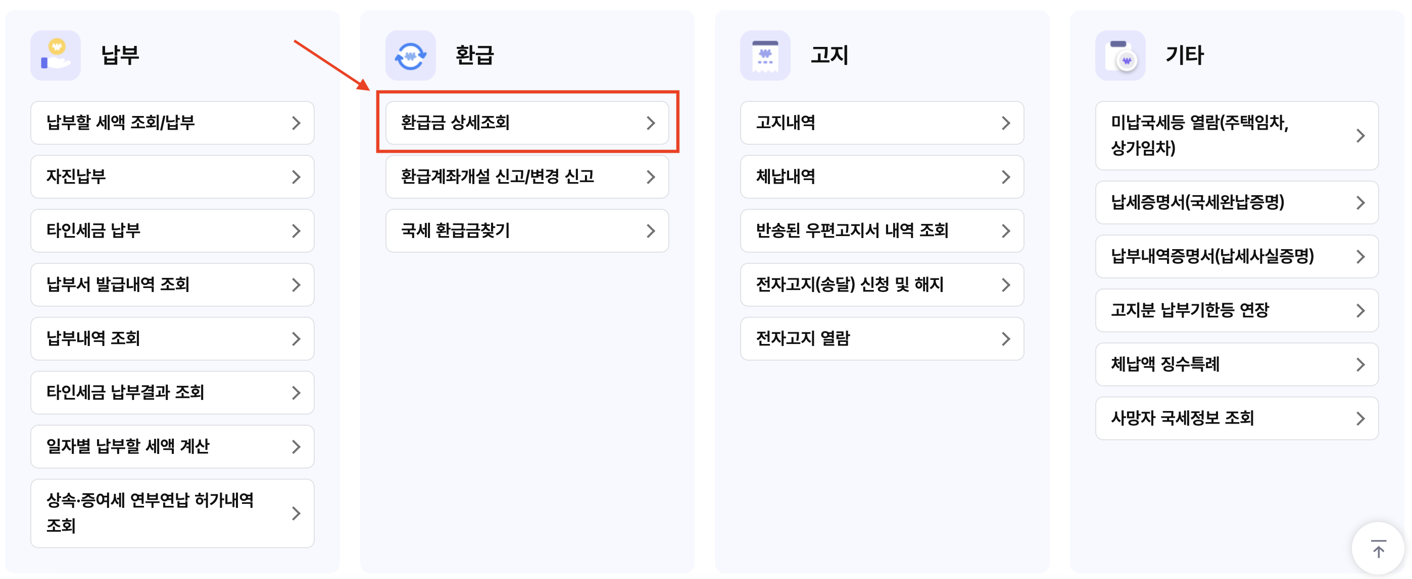 홈택스 로그인 → 납부·고지·환급 클릭 → 환급금 상세 확인