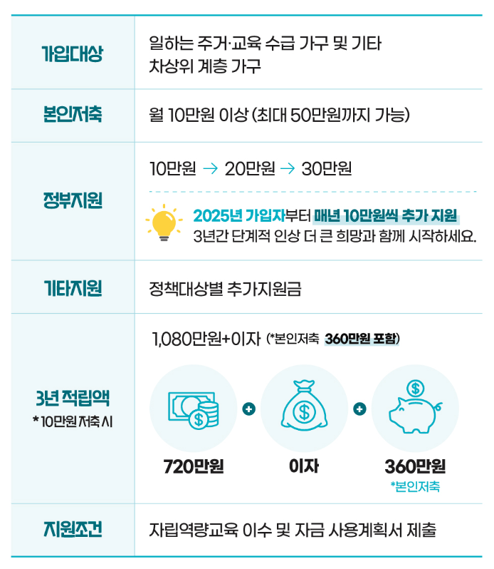 본인이 매달 10만 원을 저축하면, 정부가 추가로 월 30만 원씩 지원해 총 1,440만 원(3년 기준)을 만들 수 있는 제도입니다.